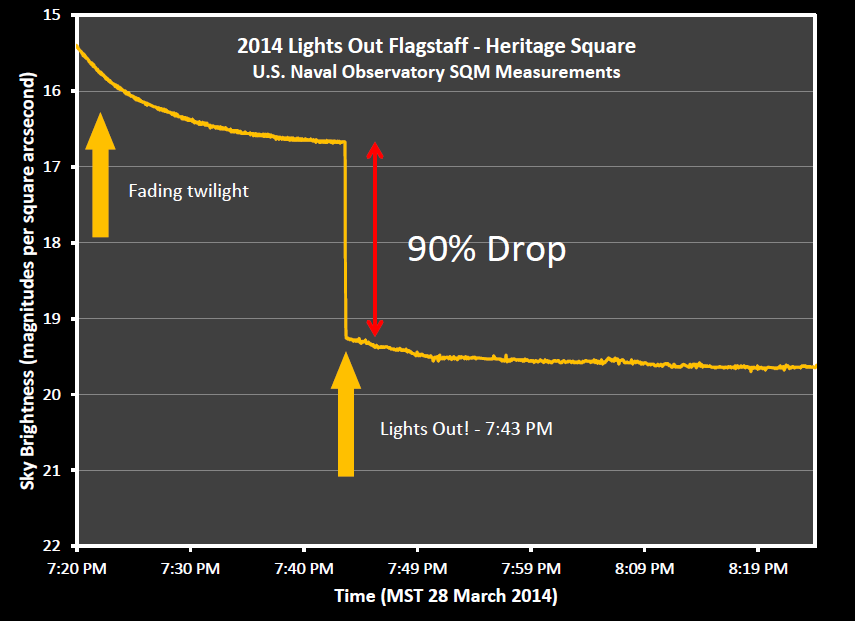 Lights Out Flagstaff 2014 April 12, 2014 855 × 621 Lights Out Flagstaff 2014 Light Pollution drops dramatically A meter measuring the brightness of the sky and nearby lights in Heritage Square shows a dramatic drop when the lights are turned off